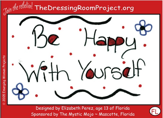 “The Dressing Room Project is a girl-powered rebellion to free girls & women from the bonds of media-imposed standards of beauty! We’re posting our girl-designed cards on mirrors in women’s dressing rooms everywhere to help girls & women feel more comfortable in our uniquely beautiful bodies.”