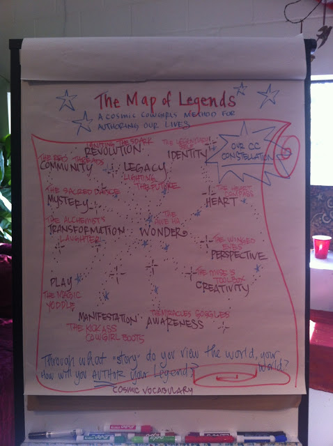 One part of our weekend’s explorations together was to discuss our developing Cosmic language.  After various sessions of heart-storming, prior to the weekend long gathering, a list of words has developed.  They are as follows: wonder, identity, creativity, perspective, heart, courage (awareness), embodiment (manifestation), play, transformation, mystery, legend (legacy), revolution, community and last but not least the overarching concept of sparkle.