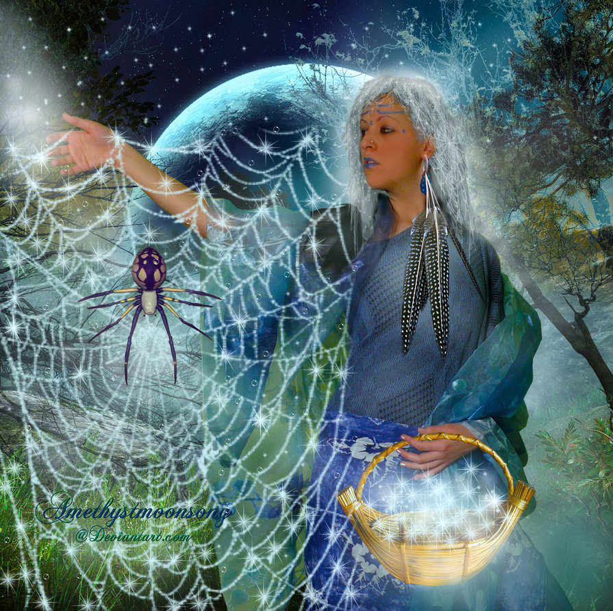 Weaves the Web, life Grandmother Spider who wove the web of the universe, teaches us how to weave the web of our experiences. She shows us how every circle we create grows to touch the circles created by all other life forms. The webs we create can trap us, if we do not create them in truth. We are asked by the Clan Mother to work with and for the truth in order to manifest a world dream that all living things can share. A web that is created in greed with eventually trap and devour the one who wove it because it was woven too tightly to allow giving, receiving, and sharing. A web woven too loosely, without care, lacks the craftsmanship that is necessary to make it strong and durable. A web woven from fear will attract the lessons needed to overcome that fear. A web woven from the love of creating and desire to share the abundance caught in the web’s silvery fibers is a web that will endure until the dream is fulfilled.