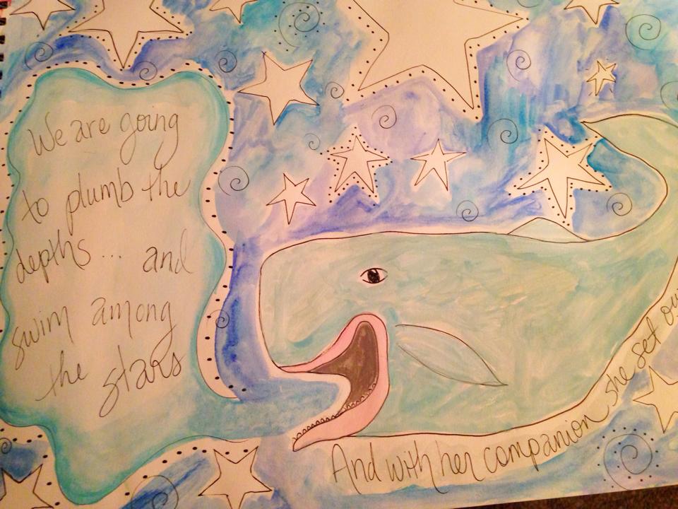 It has grown more obvious to me how, when I am closed off and in task master mode, that I can be oblivious to noticing the nuances of spirit. When I slow down and open myself to creative spirit the influx of synchronistic images or words can be profound. In January and February I had felt like I needed a break from any new commitments and had abstained from taking any on-line courses. I was still in the mode of not taking anything new, but at the last minute I signed up for The Daring Tail course, which started on March 1st. There is a theme regarding mermaids and sea life in this course. Once I was signed up I had several occasions to note that mermaids and sea life images had been showing up around me for several weeks, but that I had not noticed. A couple of weeks into the course I also remembered how I had just read the novel The Mermaid Chair by Sue Monk Kidd only a couple weeks prior. Even in the prior December Storywalking course I was astonished when flipping back a few journal pages to discover the funky mer-creature I had drawn, as well as my companion animal from a guided meditation, which was none other than a whale who had a very specific message for me: “We are going to plumb the depths…and swim among the stars.”