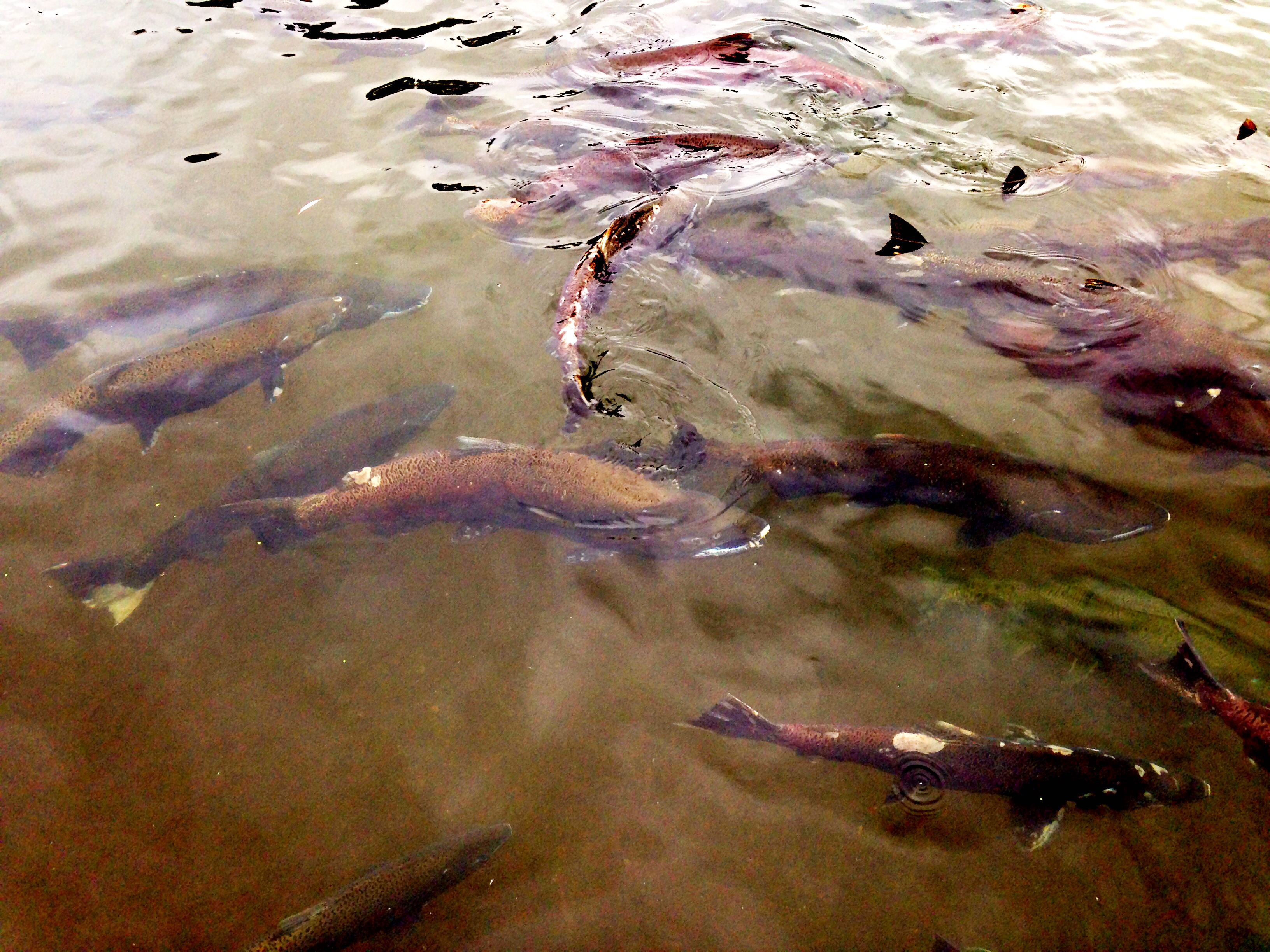 Here is a brief video of the salmon attempting to jump and vault a controlled waterfall. You can excitedly hear children cheering on the salmon as the launch themselves. We kept hoping one would make it. What we finally learned is that at this time of year the volume of water is increased to such a level that the salmon will never make it to the upper level. This forces them to look for an alternate route, which happens to be a man-made fish ladder that directs them into the hatchery pools. During the non-spawning season the water flow is reduced and fish can then naturally swim up and down stream.